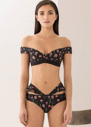Take their Dark Florals bikini, which features a vivid array of flowers on a black background. The Meadow top features off-the-shoulder straps and a sweetheart neckline that gives it a romantic appeal. But the ruffled Waist Flounce bottoms, which offer medium coverage, are just cheeky enough to give the ensemble a look of flirtatious fun.