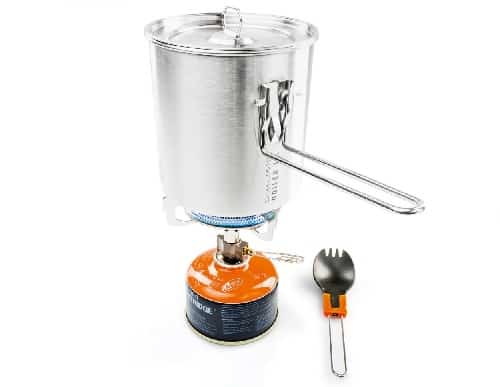 The Glacier Stainless Explorer Set from GSI Outdoors is even smaller than the Camp Chef stove, weighing in at a measly 18.6 ounces.