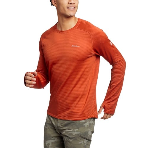 The jacket’s fit is great for wearing over base layers such as their High Route Grid Air shirt. The classic long-sleeve crew style is updated via a lightweight, moisture-wicking, two-way stretch fabric. We loved the athletic fit and the Polygiene odor control feature.