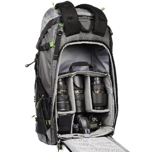 This rugged, waterproof internal frame backpack offers a whopping 45 liters of storage capacity, with ample room to store your camera gear, tripod (via built-in mounting system), and even a laptop up to 17″!