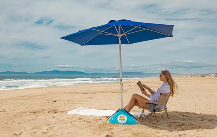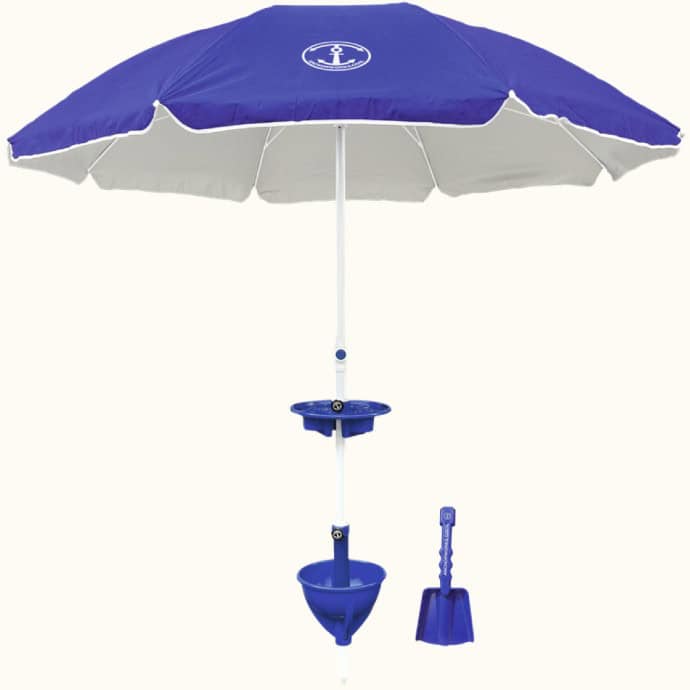 Their patented design uses the beach sand to anchor the umbrella below ground level, using physics to counter the force of the wind and secure your beach umbrella firmly where it belongs.