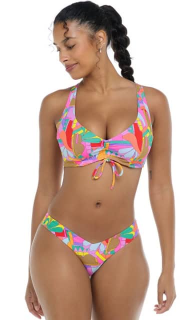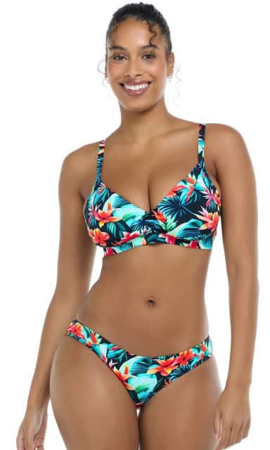 Body Glove’s Colola Bikini also comes in D-F cups, but has a more exotic floral design. The fixed triangle top has removable cups, front ruching, a wide bottom band, and an adjustable tie back for a look that’s perfect for tropical beaches.