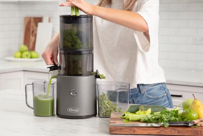 Measuring 9.02″D x 8.7″W x 18.07″H, the Omega Effortless Batch Juicer won a 2023 Best Kitchen Gear Award from Good Housekeeping, with a 2-liter (68 oz) capacity.