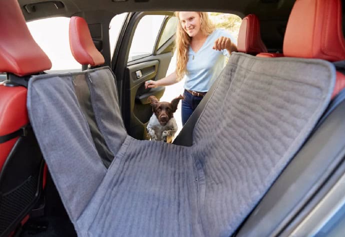 The water-resistant Grip-Tight Windowed Hammock Seat Protector from Orvis is a HUGE step up from our previous model. Using quilted upholstery from their RecoveryZone Dog Bed, it’s soft, non-slip, and easy to clean.