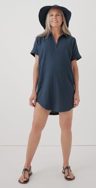 Mary also likes their Coastal Double Gauze Beach Cover-Up, which is made with a woven double-gauze fabric that gives it a breezy, flowing silhouette. The open collar, rolled cuff sleeves, and extended shirttail hem give it a beautiful beach look.