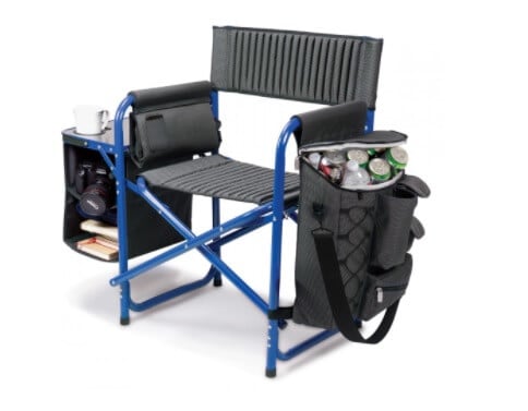This killer aluminum-frame chair is ultra-comfy thanks to ribbed padding in the seat and backrest. But what makes it cool are the tray table with accordion-style shelves, detachable 24-can cooler, cell phone pocket, and other unique features.