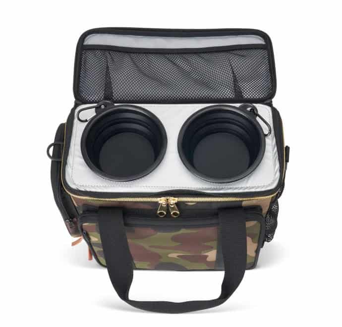 We also love the stylish Overnight Pet Travel Bag from Boulevard, which includes an elevated feeding station, 2 collapsible bowls, 2 zippered food bags, and a divider. The padded shoulder strap and luggage trolley strap make it easy to carry.