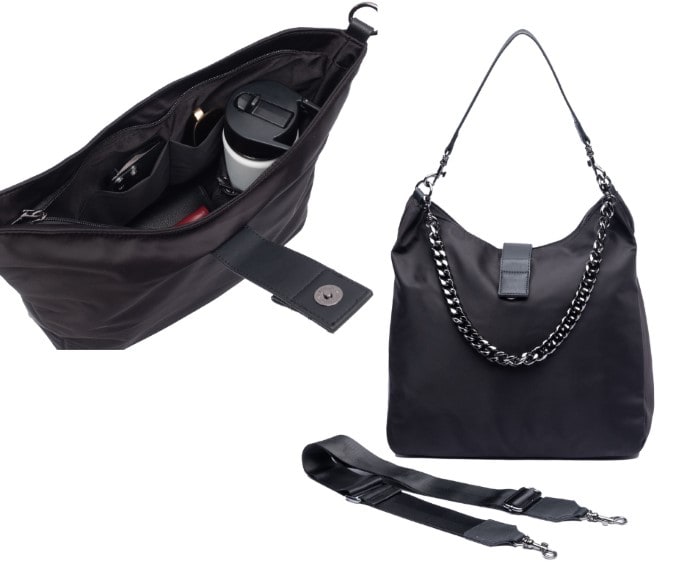 Measuring 13″ x 11.5″ x 5″, the HydroHobo Bags from WanderFull are large enough to hold your hairbrush, glasses, snacks, and more, AND they have an interior holder for a water bottle or portable coffee cup.