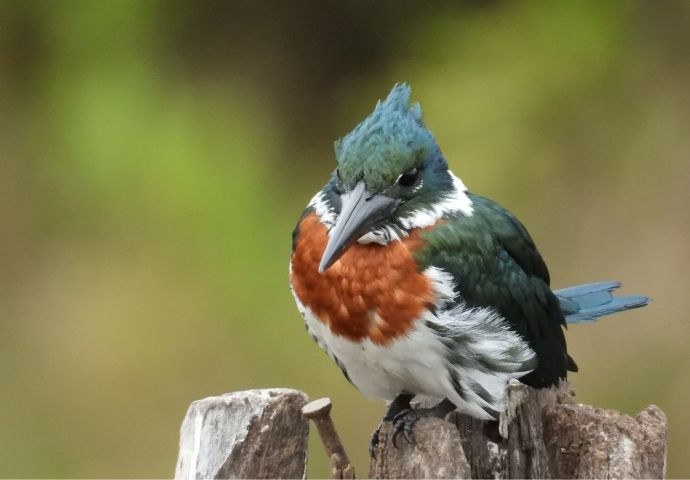 Found throughout the American tropics from southern Mexico to northern Argentina, the Amazon Kingfisher looks like a larger version of the Green Kingfisher.