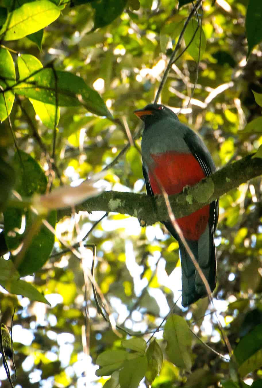There’s the Blue-crowned Trogon, whose blue-black head and red breast and eye-ring are offset by a black and white barred tail.