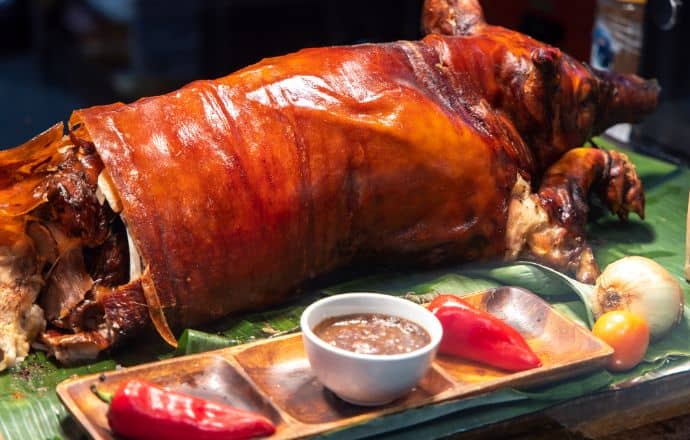Noche Buena food in the Philippines traditionally includes a variety of dishes, including lechon (roasted pig), spaghetti, barbecue, ham, fruit salad, rice cakes, queso de bola, and much more.