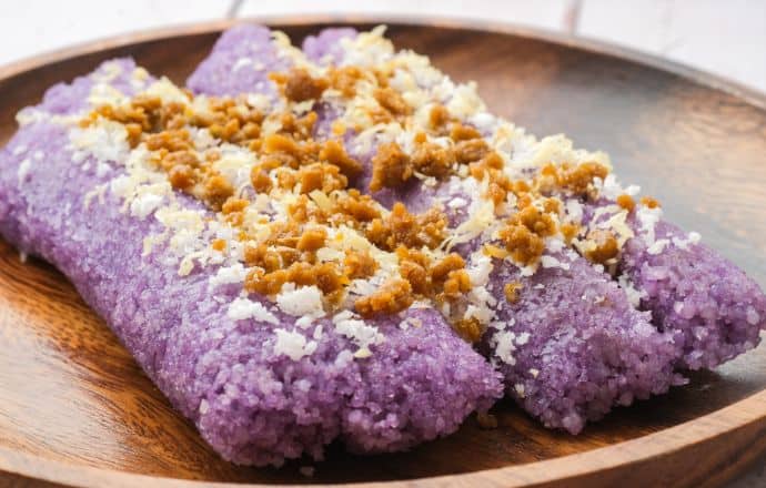 One traditional Filipino Christmas food, Puto bumbong, is a purple sticky rice steamed in a bamboo tube and seasoned with butter, brown sugar, and coconut shavings.