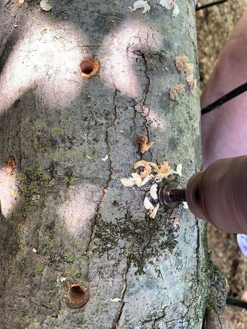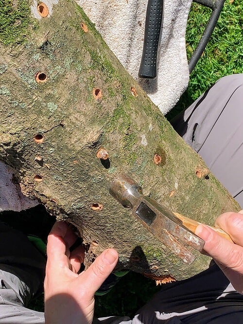 - Plugging the logs: The logs will be inoculated with shiitake mushroom plugs. This is done by drilling holes into the logs (5/16” drill bit is the standard size), then hammering the plugs into place. Holes should be a few inches apart (around 4 to 6”), with at least four rows on each log. Generally, this amounts to about 30-50 plugs per log.