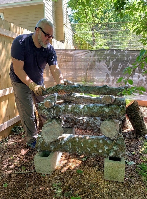 - Stacking the logs: Logs can be raised up on bricks, rocks, or other logs, then crisscrossed like a log cabin. Some people prefer to lean them upright, putting one end on the ground (a barrier from the actual soil is a good idea here). Then they lean them onto a constructed frame, or a rope strung between trees. Others will bury a portion of the log in the ground so that it stands upright.