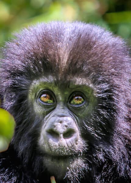 While visitors are expected to keep their distance, Gorillas don’t give a damn about rules. As we stand in a 6-foot diameter circular clearing, Urukuta’s wide-eyed curiosity brings him within 10 feet of my face. Hearing a snapping branch to my right, I move out of the way just as Big Ben (an adult Gorilla with male-pattern baldness) uses a tree branch to descend and executes a perfect somersault right where I was just standing.