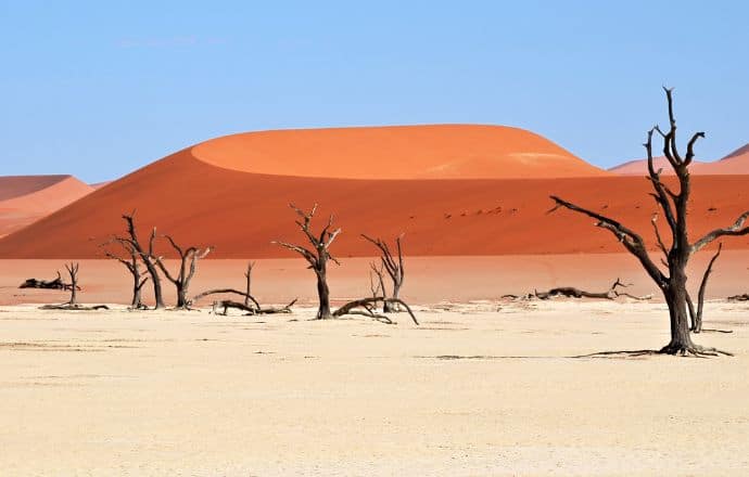 These include the striking red dunes of Sossusvlei, (such as Big Daddy, the highest dune in the national park at about 1000 ft high); the Deadvlei, with its skeleton trees set against the huge red dunes; and the famous Dune 45, a stunning place to watch the sunrise over the desert.