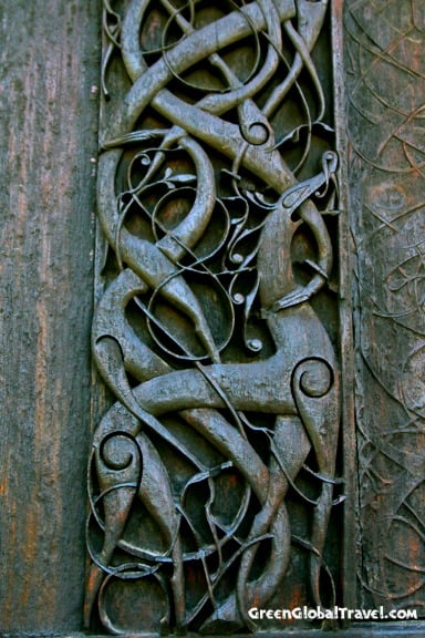 Many stave churches in Norway feature carvings that mix Norse mythology and Christianity, such as the historic stave church at Urnes.