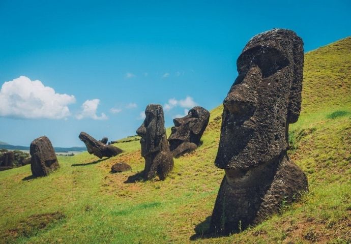 Here, you can see monolithic human figures, called Moai, which were carved over 500 years ago by the indigenous Rapa Nui people.