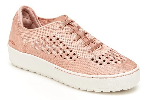The Lilac is a vulcanized sneaker whose cutout panels give them a light (8.11 oz), airy feel. The shimmery knit and leather upper is eye-catching, but it’s what you don’t see (non-slip All Terra traction outsoles and cushy foam insoles) that makes them comfy enough to wear all day and night.